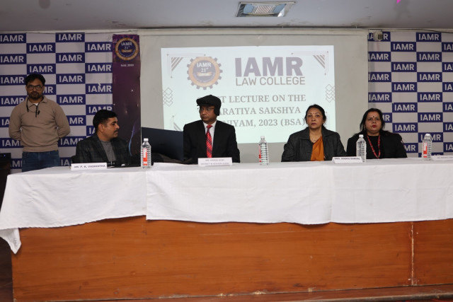 IAMR Law College is organizing an Expert Lecture on the Bharatiya Sakshya Adhiniyam (BSA), 2023 on 20th January 2026 at 11:00 AM. The session will be delivered by Sh. Harish Kumar Goel Ji, District & Session Judge, and Pauri Uttarakhand, who will share his valuable insights on India’s newly enacted evidence law. The lecture will focus on its practical application, judicial interpretation, and future impact on the legal system. This academic initiative aims to enhance students’ understanding of contemporary legal reforms and courtroom practice. The event reflects IAMR Law College’s commitment to providing exposure to distinguished members of the judiciary and promoting experiential legal learning.